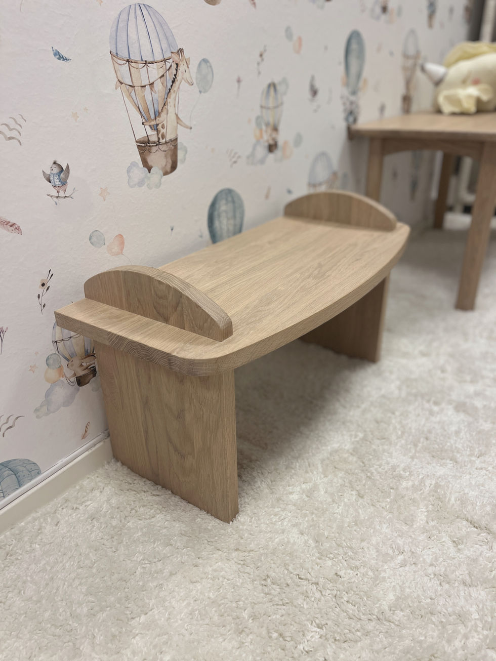 Denne krakken er laget i massiv eik og bærer Loelias signatur – rene linjer, godt håndverk og naturlige materialer. Den smale dybden på 70 cm gjør den anvendelig både som sittebenk, avlastningsbord eller nattbord.